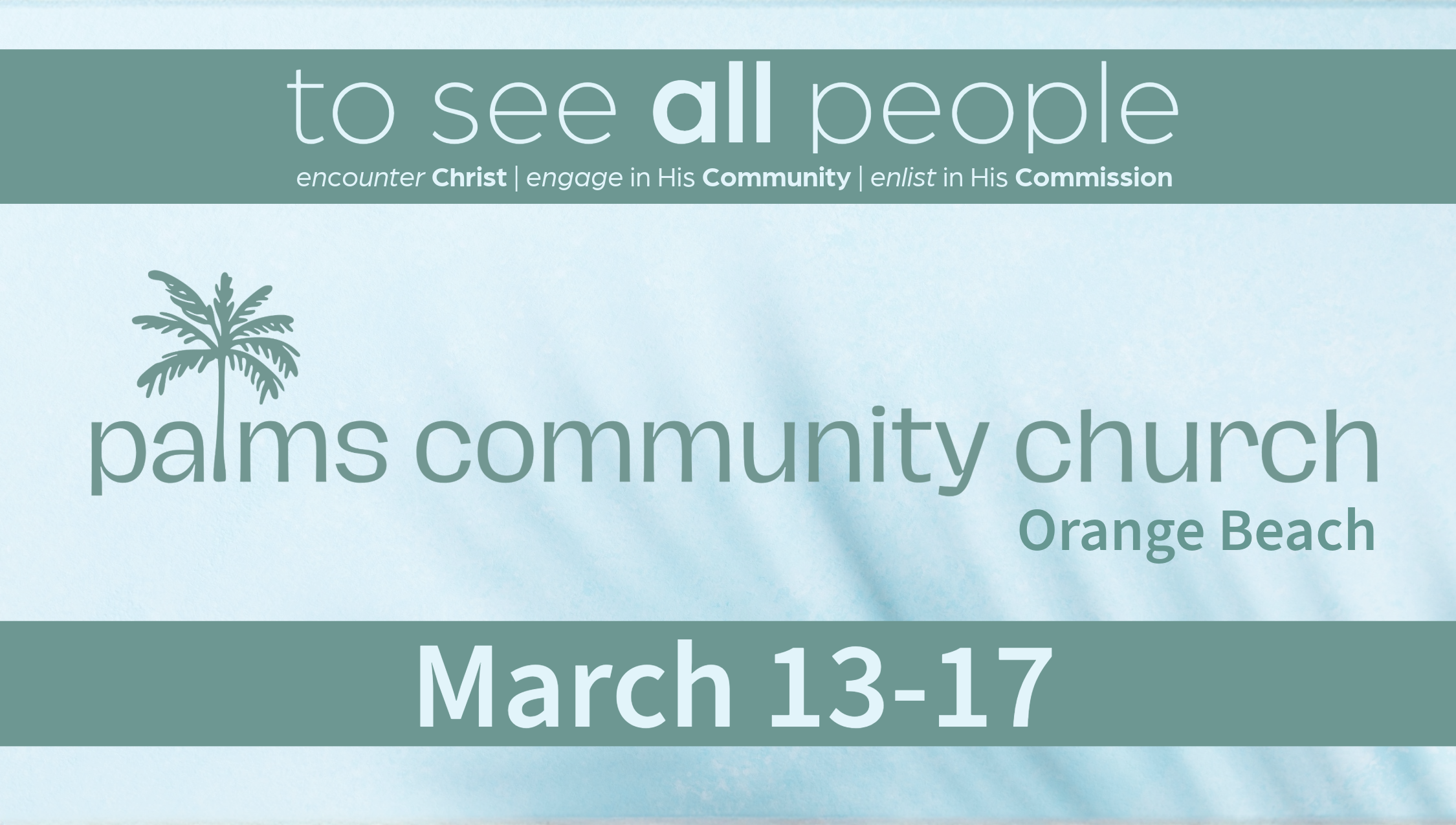 Palms Community Church Mission Trip is scheduled for March 13-17. We will be going to Orange Beach to support our newest missions partner as they prepare to launch weekly worship services. The cost is $150 per person, and scholarships are available. Registration is open online and in the Church Center App. Whether you’d like to commit to serve, or if you’d just like more information; you can sign up today to let us know!